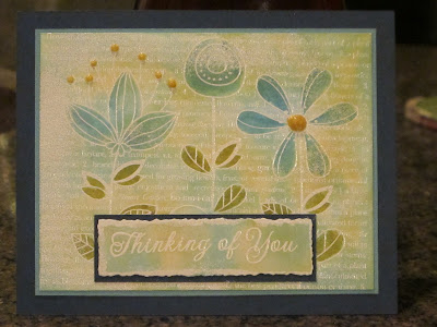 The background was sponged with broken glass and shabby shutter, then stamped with versamark and embossed with fine detail white. Although I did dry the image with a heat gun prior to embossing I still mangaged to get some powder on the edges. But I decided to just go with it, and after embossing the sentiment I ran a versamark pen around the edges and embossed with white again to create the same effect. The flowers and leaves are colored with distressed ink and a water pen, using peeled paint and broken glass. I then added scattered straw distressed stickles to the flowers. Check back Wednesday to see the second card with the set. Thanks for stopping by!